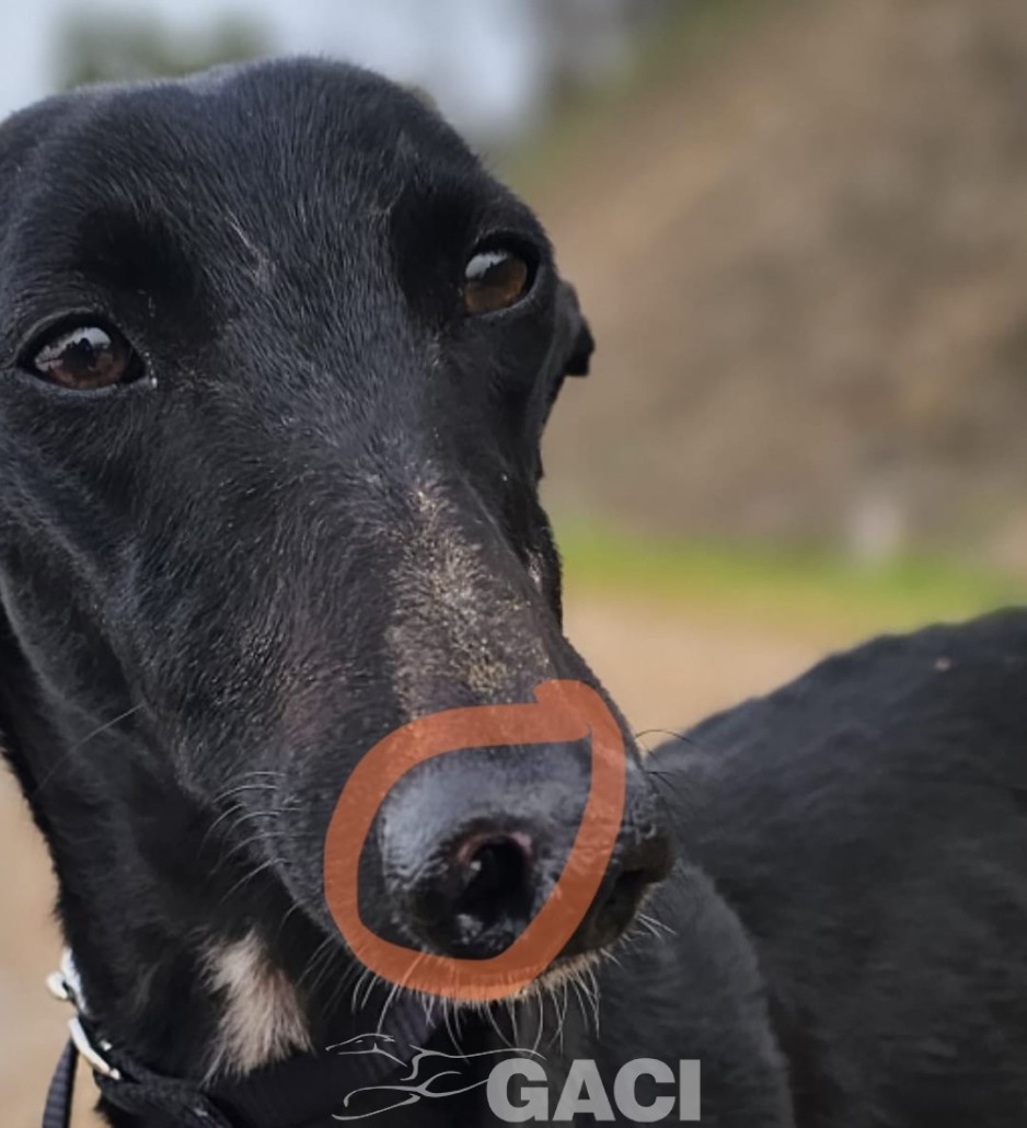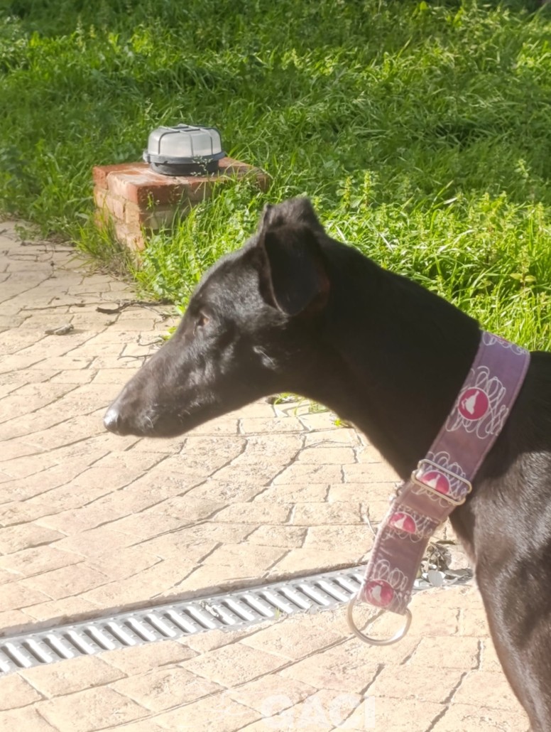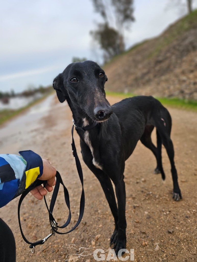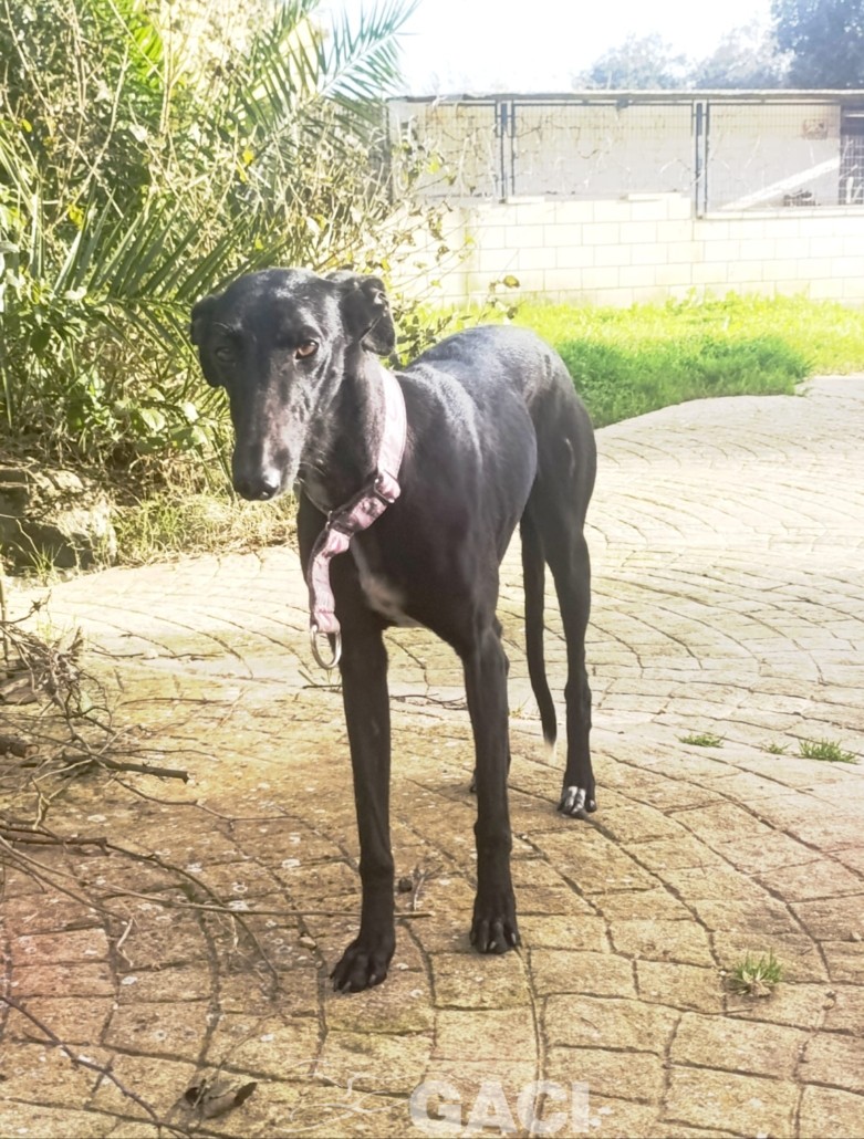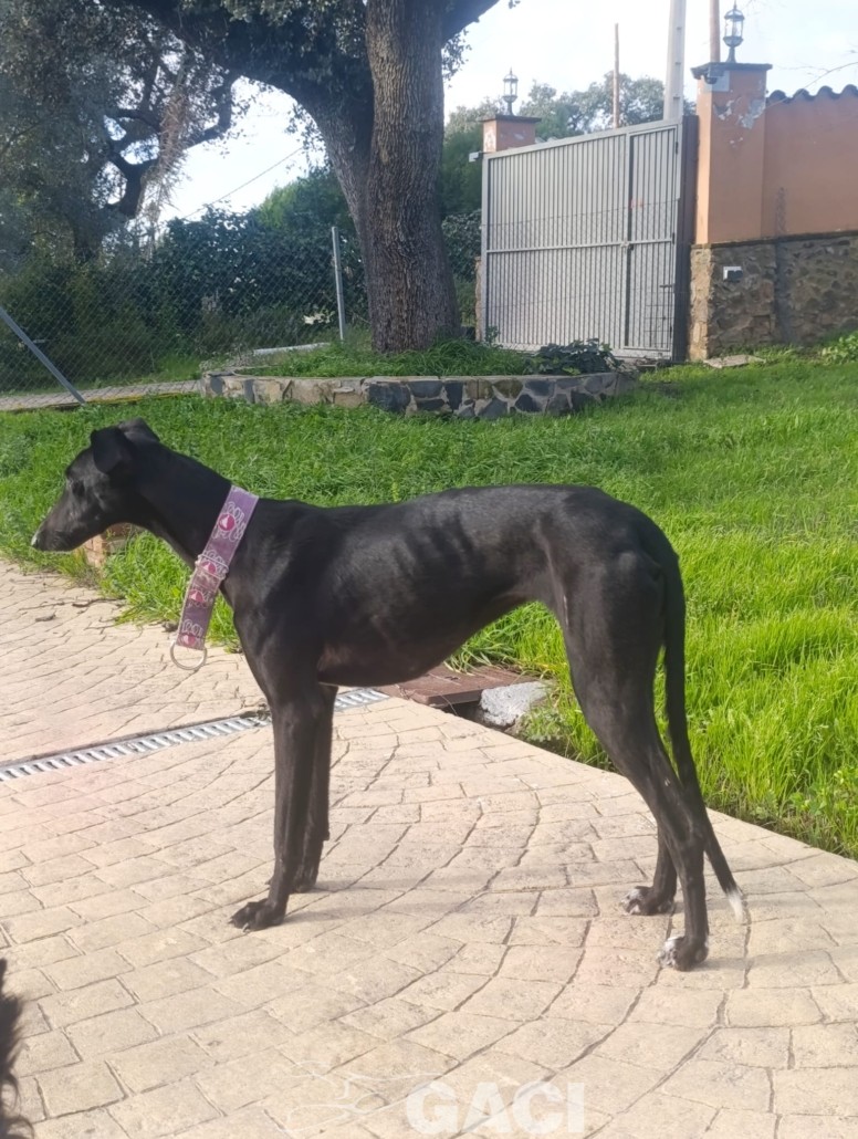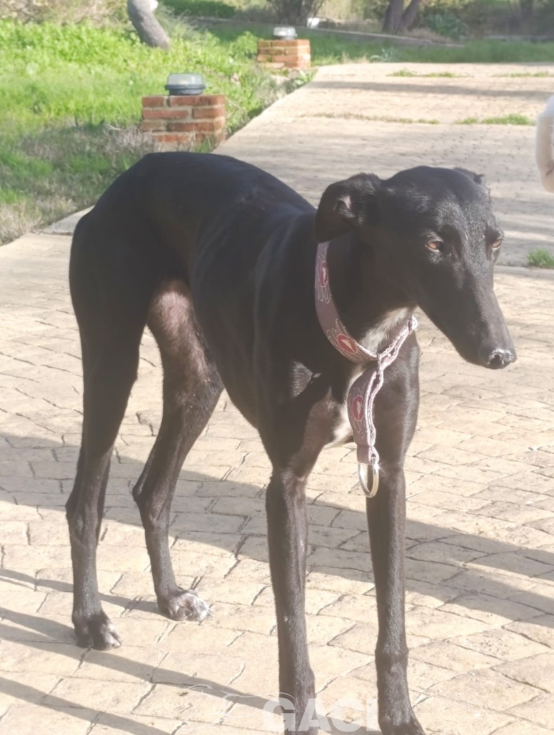 Come tutti i galgos giovani è solare e molto veloce nel rubare cibo, nel fare marachelle. Al guizaglio paseggia perfettamente, senza tirare e obbediente.